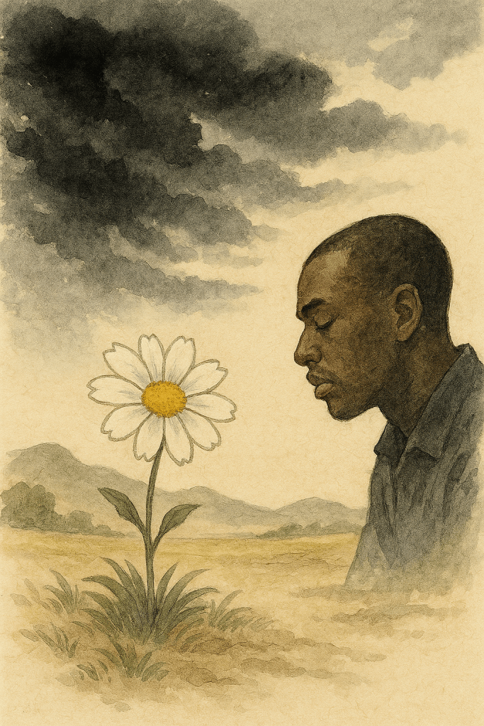 After the storm has passed, when everything seems swept away, a single delicate flower quietly blossoms. It grows from a seed scattered by the wind, blooming with a gentle longing and quiet strength. Though the storm may take much, it also leaves behind unexpected gifts. That one flower, standing alone beneath the vast sky, reminds us that even in loss, something beautiful can emerge.